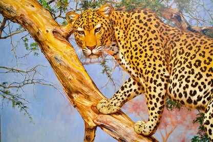 نمر مرقط على شجرة هي لوحة زيتية مذهلة وحيوية بحجم 150 × 100 سم أنجزها فنان تايلاندي موهوب، تم إنشاؤها في عام 2022. تلتقط هذه القطعة الفريدة خفة ورشاقة نمر مرقط جالس على شجرة، مما يرمز إلى القوة والرشاقة والجمال البري. الاستخدام البارع للألوان والضوء والملمس من قبل الفنان يحيي المشهد، مبرزًا الشكل النحيف للنمر والتفاصيل المعقدة لبيئته.